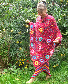 Poncho wydziergałam z moherku zawierającego kolorową ozdobną nitkę. Krawędzie obrobiłam kwadracikami. Pozostałe kwadraty przyszyłam na wierzchu.